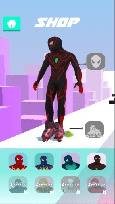 蜘蛛侠的滑板鞋是休闲益智类的游戏,玩家通过控制卡通人物不断的进行闯关,利用自己的滑板鞋在赛道上冒险,过程非常的轻松愉快,有大量的障碍物需要躲避,用各种你意想不到的方式来通过关卡。