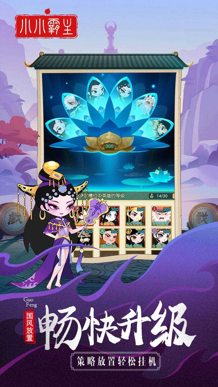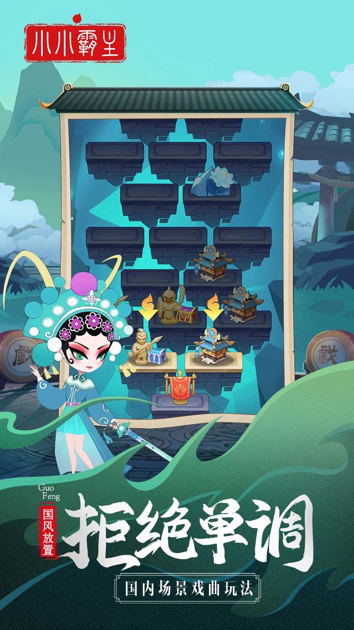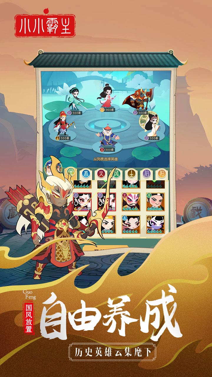 《小小霸主》融合了中国国粹艺术京剧等多种曲目中经典的造型,生旦净末丑样样俱全,加以现代化的Q版设计,角色清新脱俗,在放放英雄的世界中,玩家可以招募到多种多样的中国曲艺角色,受到了众多年轻人的追捧喜爱,当下国潮兴起,国风盛行,在中国进行伟大复兴的历史潮流中,这款游戏极大的贴合了玩家们的国风情怀,融合轻度的放置养成玩法,是可以揣在口袋里的精致文化盛宴。