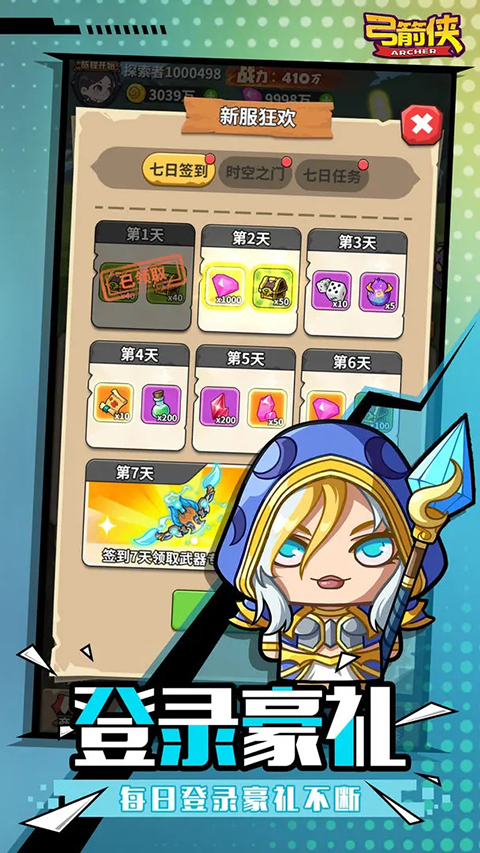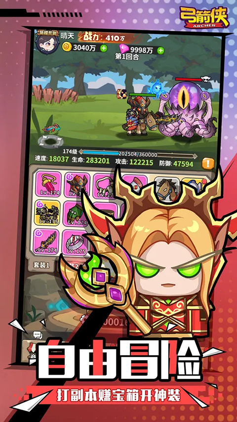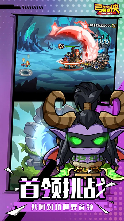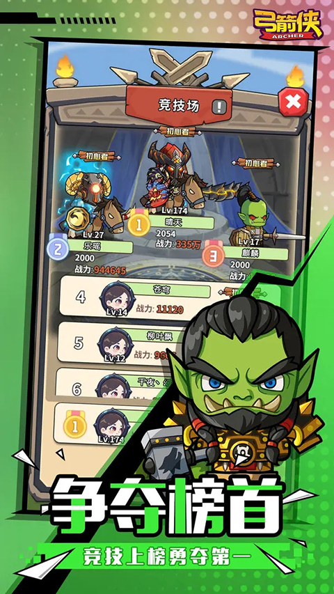 弓箭侠是一款放置点击类游戏。游戏以开宝箱玩法获取装备为主,玩家获取的装备可以用来提升角色属性,提高战斗力,让玩家可以更快的击败BOSS,通过关卡,玩家还可以边开宝箱边闯关,非常有趣。玩家还可以对宝箱进行升级,让宝箱开出的装备更高级。游戏内还有竞技场模式可以进行挑战,玩家之间可以进行挑战,挑战成功可以获得大量金币和高级装备以及进行排名,战力越高的玩家排名就越高。