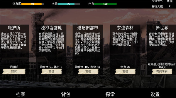 末世求存游戏中会随机出现各种事件需要你做出选择,每一个事件都会让你体验到不一样的乐趣。超高的自由度,可以根据自己的想法来选择发展道路,体验到生存的艰辛和求存的压力。感兴趣的小伙伴快来下载体验吧。
