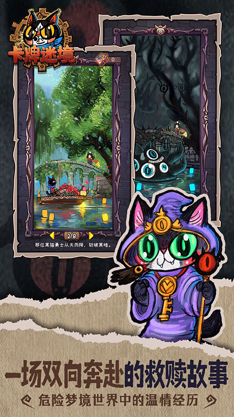 卡牌迷境手游官方版是一款以猫咪为元素,肉鸽玩法为核心的休闲卡牌游戏。独特的画风,新颖的剧情设定,紧张刺激的对决,搞怪的音效,在这里,你需要跟随猫咪勇士,打败猫咪怪兽、猫眼巨人、狂野稻草等发生变异的猫咪,拯救世界。游戏在玩法上,采用了经典的肉鸽玩法,极其简单的战斗方式,增加了大量的烧脑的元素,战斗不仅仅需要勇气,还需要智慧的结合。另外,卡牌迷境手机版以梦境为核心,噩梦与美梦的交织,随着玩家的深入,游戏会逐渐从黑暗恐怖变成清新治愈。独特的结算机制,在保证游戏可玩性的前提下,照顾到了大多数休闲玩家的碎片化游戏需求,所以大家还在等什么,感兴趣的小伙伴赶快来下载体验吧。