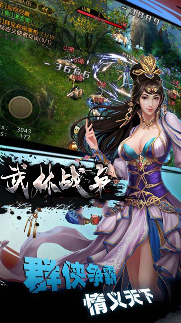 《武林战争》是一款多人在线角色扮演类手游。玩家可在少林、武当、峨眉三种职业中进行选择,在游戏中,玩家通过探索各个等级的地图获得经验、材料、装备来强化自己的能力,成为可以在游戏中号令群雄的霸主。