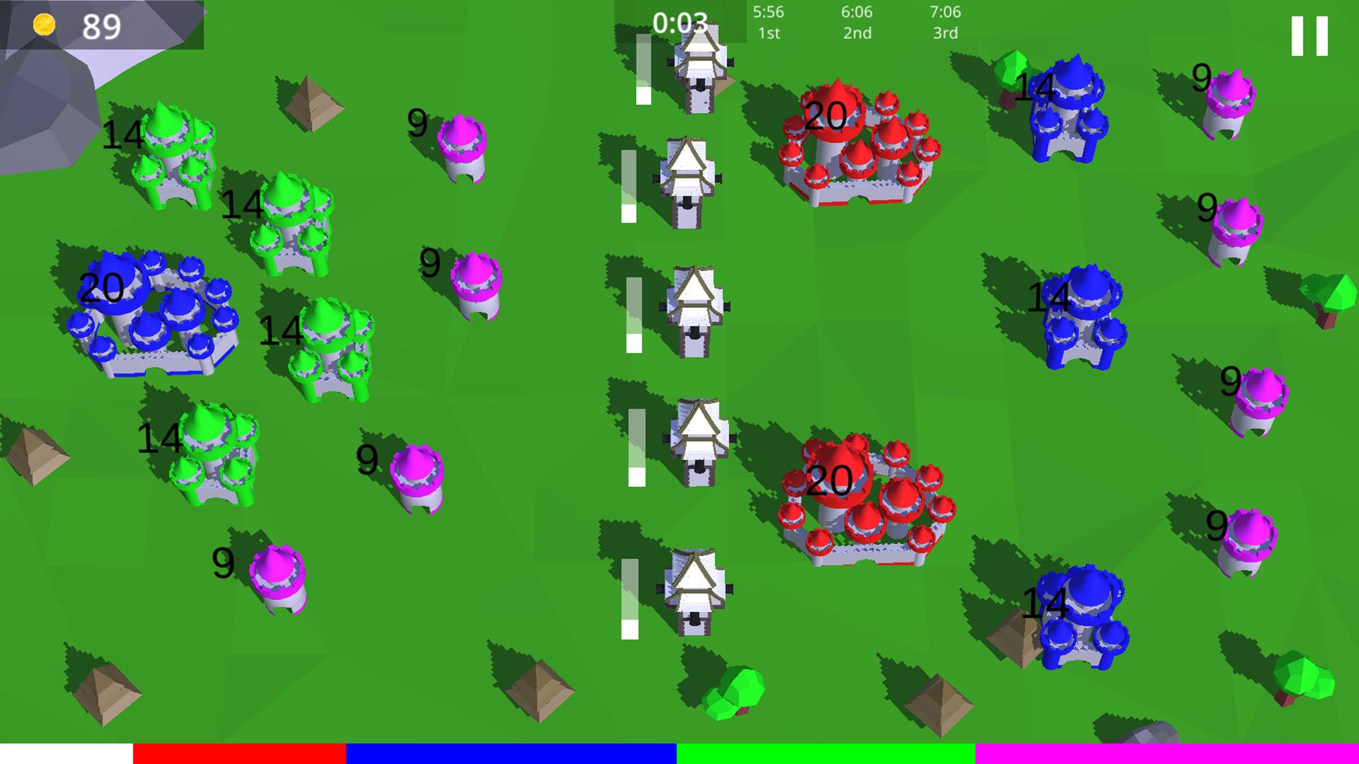 1、玩家控制地图上的红色城堡, 白色为中立城堡,其他为AI;