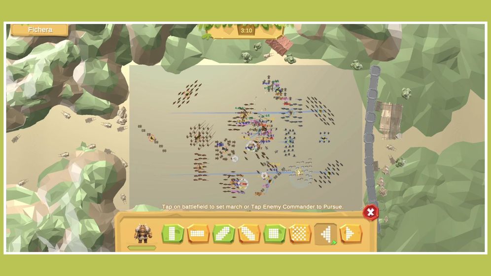 2、在己方阵营中排兵布阵,每回合自动出兵,兵种自动进行战斗,快来挑战吧;