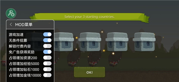 此版本已由网络大神破解完成,游戏内置菜单功能,包含了游戏加速、无条件招募、解锁付费内容、免广告获得奖励、占领增加资源200等多种修改功能,可以为玩家带来更好的游戏体验感!波兰球之战中文设置说明