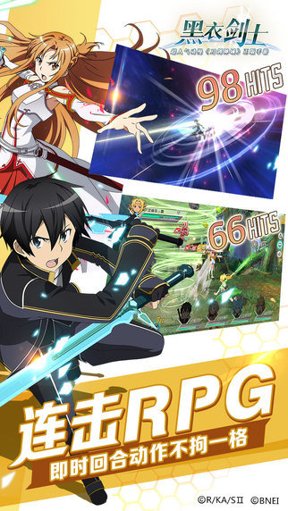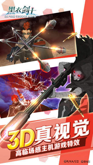 国内正版《刀剑神域》手游《黑衣剑士》降世!原版配音、原著剧情,圆你刀剑梦想世界!黑衣剑士桐人、闪光亚丝娜、绿之剑士莉法、冰之狙击手诗乃……原著人物全员等候召令!独家番外剧情!SAOALOGGO无缝穿梭 独家正版剧情,一手资料!极速穿越,SAO、ALO、GGO三大世界无缝衔接,快来体验三部曲不一样的玩法体验,可饥饿游戏,可扩充后宫,可近战射击,任你所爱! 攻略前线的使命!