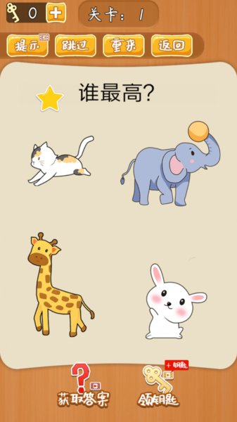 游戏适合年龄小的小朋友来玩,关卡答案特别的简单,虽然每一个问题都是不一样的,答案也是需要一定的思考的,对于小朋友来说难度适当吧,舒适的背景音乐,可爱的动物形象,也是很适合小朋友来玩的。