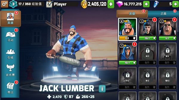 1、在游戏首界面大家可以发现这里具备着大量的角色可供大家选择,但有一个前提,等级要够才能解锁,每个角色的着装、附带武器也各有侧重,棒槌、刀、板砖可谓千奇百怪。
