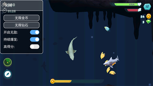 在游戏中玩家可以用钻石购买怪兽鲨鱼,当然我们已经解锁了无限钻石,所以相当于免费获取,怪兽鲨鱼可是个无敌的存在,连鱼雷都可以吞食,没有任何害怕的东西。