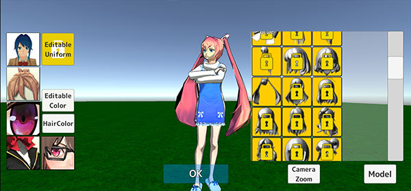 2、左侧从上到下依次是套装、发型、眼睛以及装饰和眼镜,右侧是各种未解锁的新造型,点击可以解锁使用,装扮完成点击“OK”。(右下角Model有很多好看搭配好的人物套装可以一键选择)
