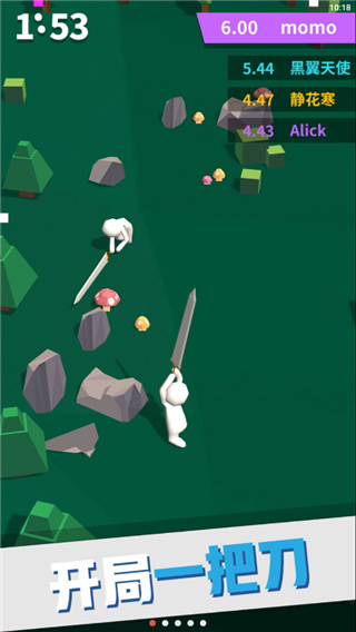 1、游戏玩法对于游戏玩法来说,还是比较简单休闲的,开局一把刀,后期也不一定是刀,有斧头、大棒等等都有可能,在这个局限的世界中不断的进行劈砍,无论是砍树还是砍人都能够增加你刀的长度,其中砍人会增加的比较多,砍树比较少,在2分之内,没有阵亡的玩家谁刀更长谁胜利。