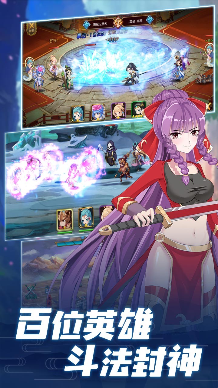 2. 目前开放有上百名三国神将卡牌,吕布,关羽,赵云等三国志武将们萌系大变身!速度强化装备和武将组建精英强队!