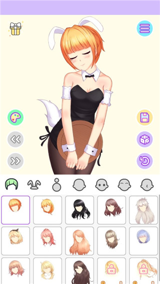 1、提供了各类眉形、发型、衣服、裤子、鞋子、袜子以及各类小的装饰品、背景画面,任意DIY2、操作画面暖心、简洁,可拖动,可删除,可调色,可全屏,还可一键初始化,简单快捷的进行化妆和装扮