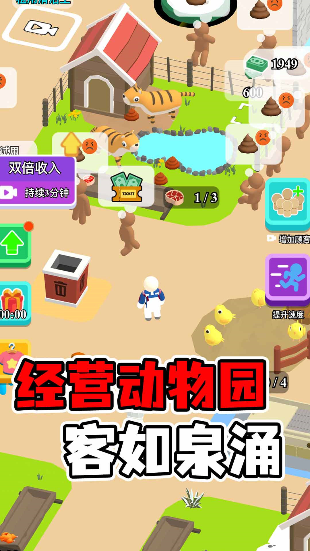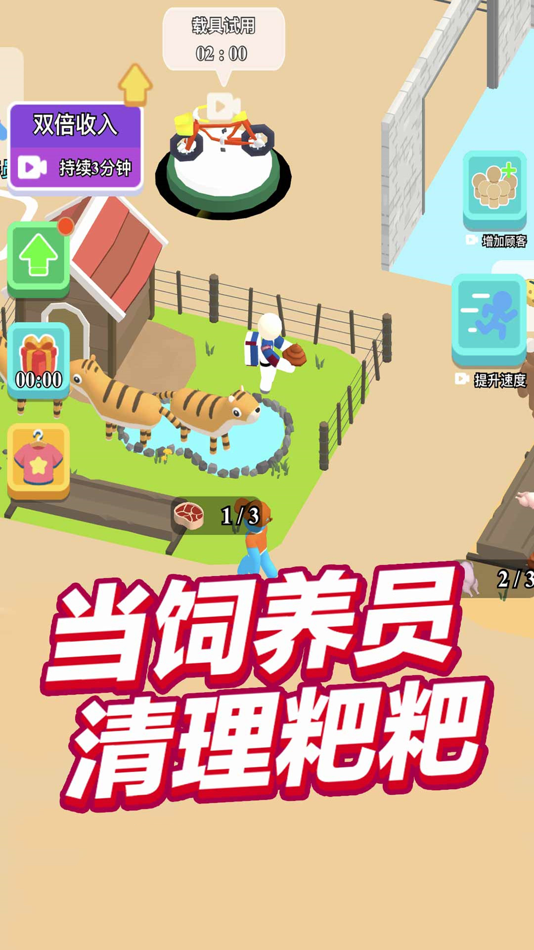 玩家通过喂饱你的动物,打扫动物园,卖门票尽可能多地赚钱!隔一段时间有小偷进入,偷钱和动物,不要让他们从你身上偷走任何东西!你玩得越多,你的生意就越大。扩大并建立你自己的动物园生意,然后赚钱!