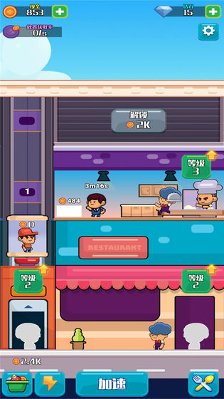 模拟快餐厅---这是一款全套模拟餐厅场景的时间管理型小游戏,在这里,你既是厨师又是经理,又或者是一名电梯工。随着你加快的手速,可以提升餐厅中所有角色工作的速度,缩短并加速顾客等餐时间!对了,别忘了点击加速按钮哦~ 整个大局就由你来操控!