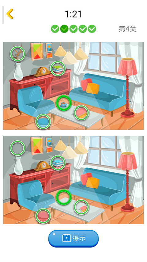 第4关答案:凳子、咖啡、桌上书本与柜子上的书、瓶子里的装饰物;
