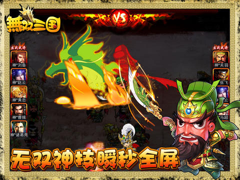 全场黑屏超炫大招,叱咤风云武神技能炫全场,精美华丽的技能画面让你亲身驰骋想象中的战场。狼烟四起,四方扰攘,民不聊生,别怕!看我大招秒杀众奸臣!