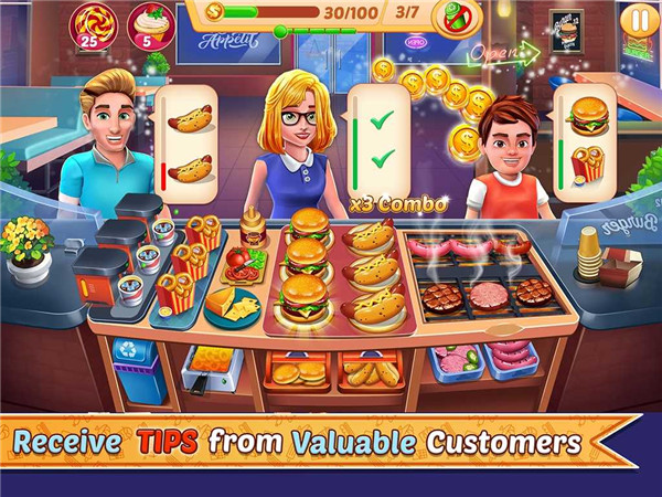 烹饪大亨餐厅官方版是一款以餐厅为题材的厨师烹饪游戏,游戏拥有非常简单的卡通风格,在游戏中你将扮演疯狂的烹饪餐厅厨师,你可以通过提供快速的服务来讨价还价,在疯狂的餐厅中以最美味的食物取悦饥饿的顾客。游戏的核心玩法是以时间管理为主,通过不同组合满足顾客的需求,由于美食制作时间的关系,玩家在选择顺序方面就需要有一个快速的反应,特别是后面内容越来越多,组合也复杂后,游戏的操作也紧张了起来,可以让你身临其境地体验厨房烹饪和时间管理的乐趣。并且可以不断的了解全球美食,成长为一个为美食疯狂的顶级大厨。同时从雇佣服务员,从点菜,上菜,到结账,丰富的玩法,保证让你沉浸其中,会给大家带来非常欢乐的餐厅经营体验。不仅如此,烹饪大亨餐厅游戏中拥有各种食材可烹饪许多美味的食物,例如甜甜圈,汉堡,香肠,比萨饼,三明治,蛋糕,烧烤,炸薯条,烤肉串等。且随着疯狂厨师之旅的进行,你会发现并解锁许多地方,体验不一样的烹饪场景。此外,烹饪大亨餐厅游戏中拥有海量精心设计的关卡等你挑战,相信每一个关卡都能够为等你带来与众不同的烹饪体验,喜欢的朋友快来下载体验一下吧。