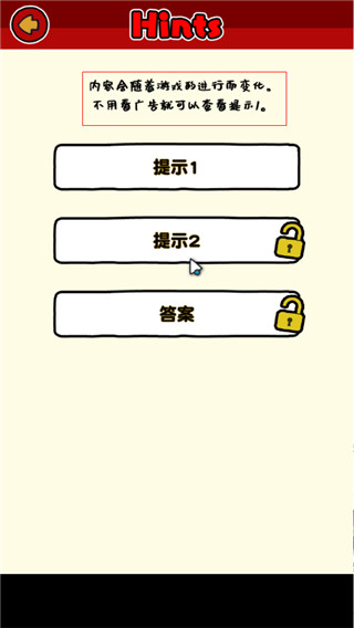 2、每一个关卡都会有一次提示的机会,当然你也可以不用这次机会,这些提示还是有所帮助的。