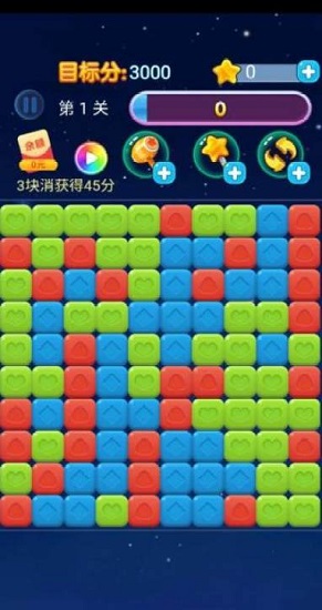 非常经典的消除方式,只需点击两个或以上的相邻同色星星便可消除,没有关卡限制。使玩家痛快一消到底。