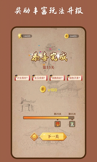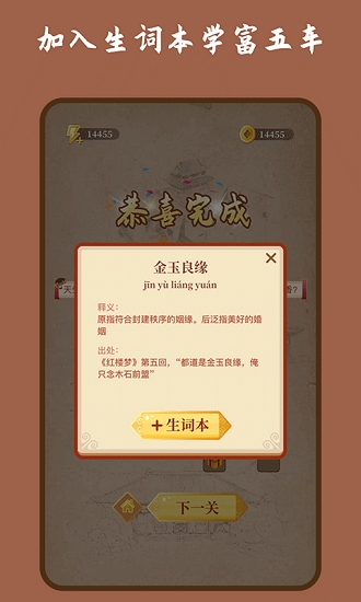 - 温故知新:游戏内所有成语均可查看释义与出处,还可以添加到生词本随时复习。