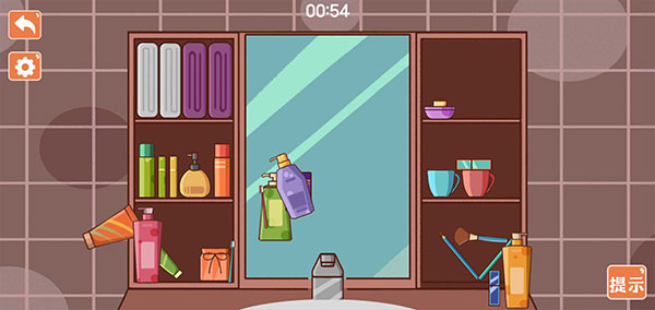 5、右下角可以免观看获得提示,在有限的时间内按照提示完成收纳摆放。