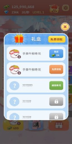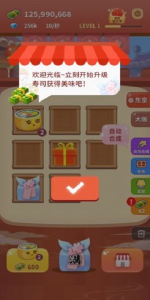 - 放置类的游戏玩法,进行自由的制作,将不同的食材进行策略的搭配,制作美味的寿司;