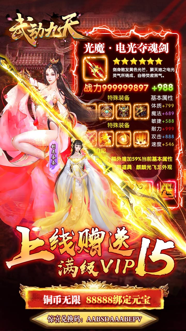 大型玄幻武侠类arpg【武动九天】强势登场,上线赠送满级V15,88888绑定元宝,铜币无限,更加过分的是玩家达到100级时送100元模拟充值,100级对于大侠您来说,就是信手拈来的事情,100元模拟充值请放进口袋装好。