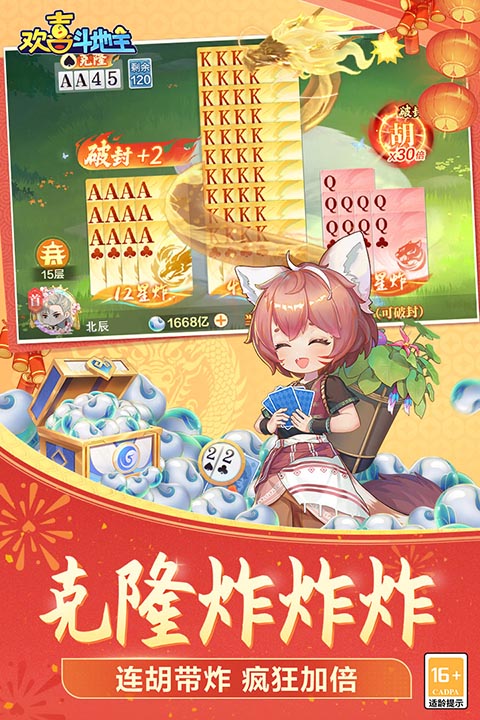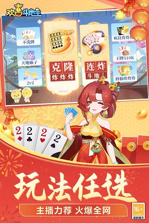 欢乐三人+癞子+四人+疯狂炸蛋,多种玩法应有尽有!抢地主+明牌+最后手牌等功能助您疯狂加倍赢钱,一把翻身做地主!