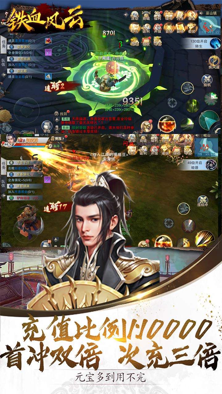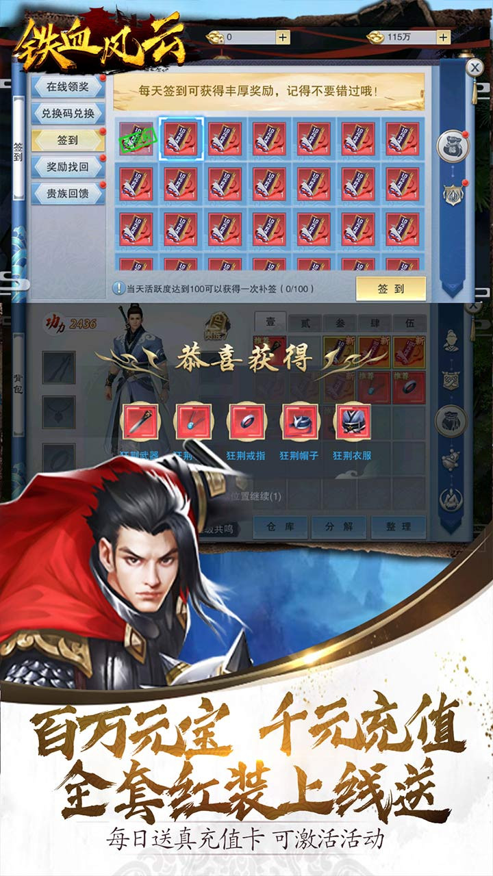 《铁血风云BT版》是一款以武侠题材为背景的大型即时战斗MMORPG手游,上线就送VIP7元宝*1000000千元充值卡超级红装宝箱银币*200W,每天还送真充值卡,游戏以畅快的操作和激烈的竞技为游戏核心体验。百花、蜀山、龙将、罗刹四大职业,各自拥有不同天赋与独特的武功技能,带领玩家体验各种侠义豪情,称霸武林!