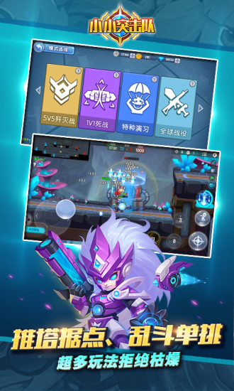 小小突击队是全新的横版moba射击手游,小伙伴们化身为刚毅的冲锋枪战士、冷静的狙击枪手、犀利的忍者等多个英雄后,展开精彩刺激的5v5枪战。清新亮丽的画面,可爱酷炫的q版角色,加入丰富的逼真音效,将给你带来前所未有枪战的震撼,以及竞技的炙热气氛。
