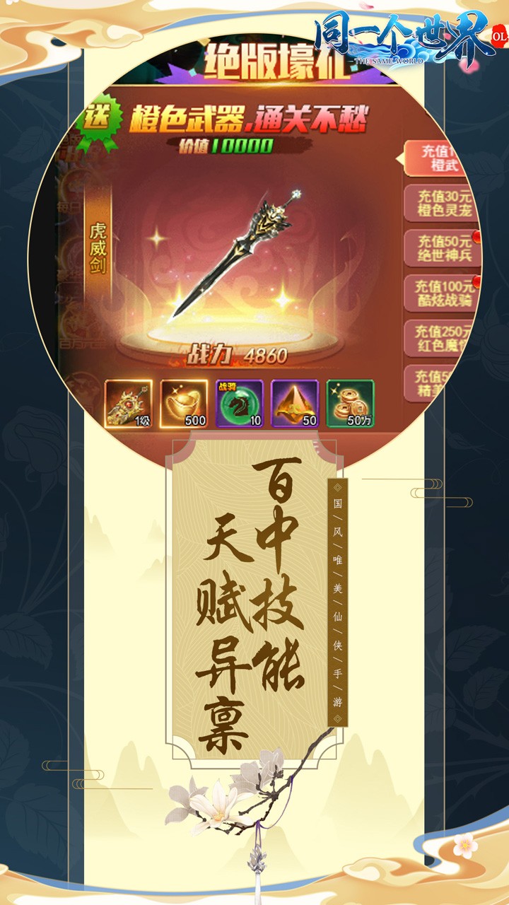 《同一个世界OL手游BT版》是一款唯美仙侠风格的动作角色扮演类游戏,在游戏里,结交好友开宗立派,邂逅侠侣定情结缘,神宠神器应有尽有,外装坐骑精美酷炫;渡劫飞仙,快来一起探索仙侠仙界吧。无限制的等级,在进行等级提升的同时还能够解锁新功能;,多种精彩的副本地图,丰富的世界BOSS等着你来挑战。