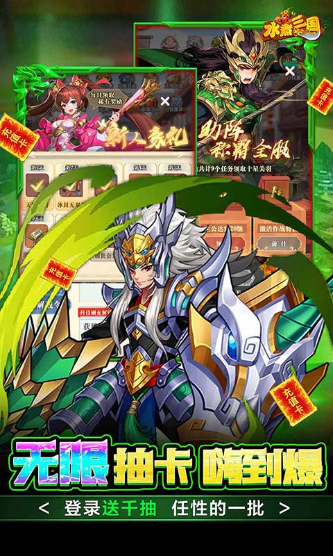 4、新人豪礼,登录就送魏蜀吴、神魔【十星】武将,更送创世套装,7万现金券