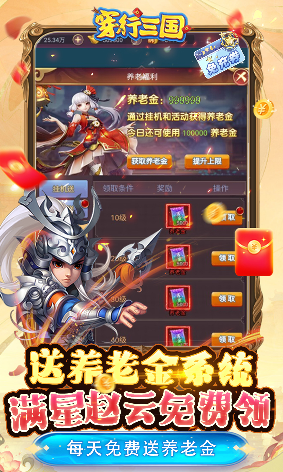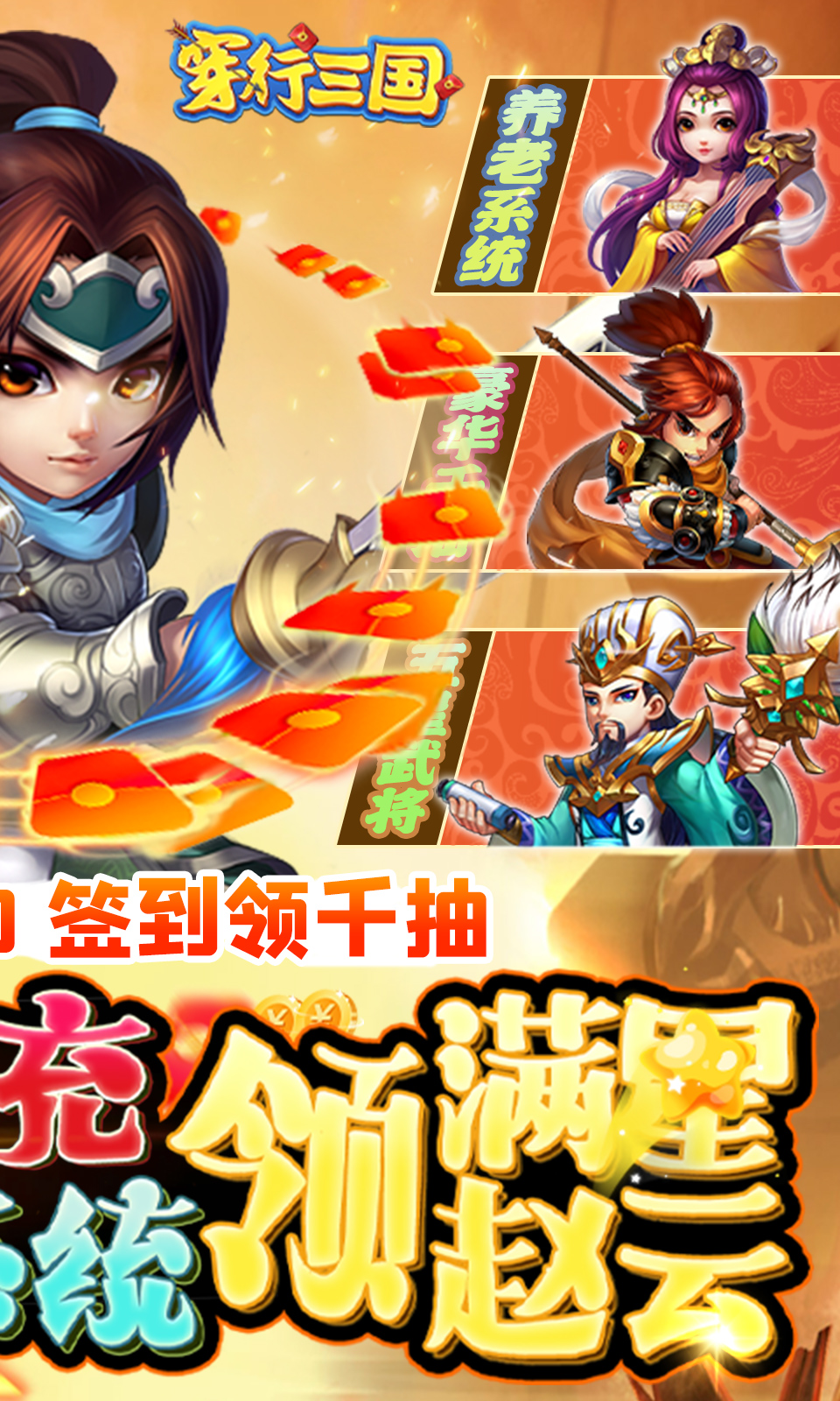 穿行三国(全武将免充)是一款三国题材放置卡牌类型游戏,多种多样的卡牌组合和炫丽的招式特效、还有经典的三国人物,上线即可领V10、登录即赠送推荐PVE橙将阵容,每日签到送1000抽,连续7天,总共送7000抽,全民打金刷充,挂机即可领取养老金,免费获得满星赵云,超多的三国武将,让你不花钱也能畅享体验,超多福利无限刺激,快来参与~