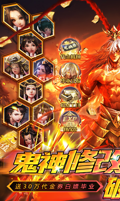1.上线送VIP7,领取鬼神吕布,天金修改器包毕业,每日领取专属橙装、成长资源,海量福利!