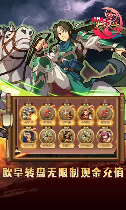 1、新人豪礼送十星武将,千次抽卡,上线即送百元现金券,千万资源