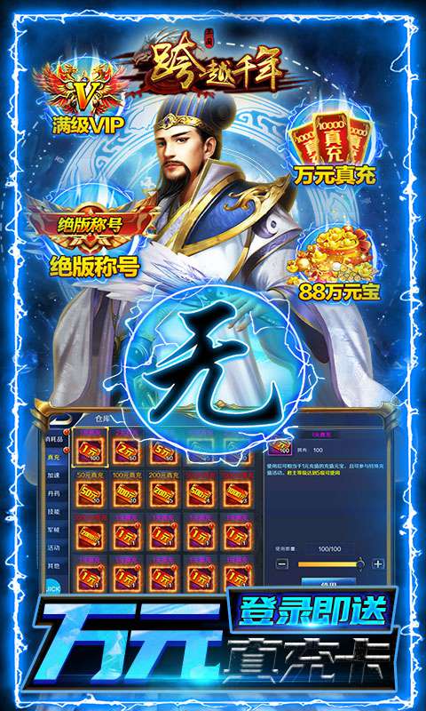 1、充值比例1:500!上线送VIP8,送1888元充值卡、38888系统元宝、188万银两,送海量稀有材料宝箱