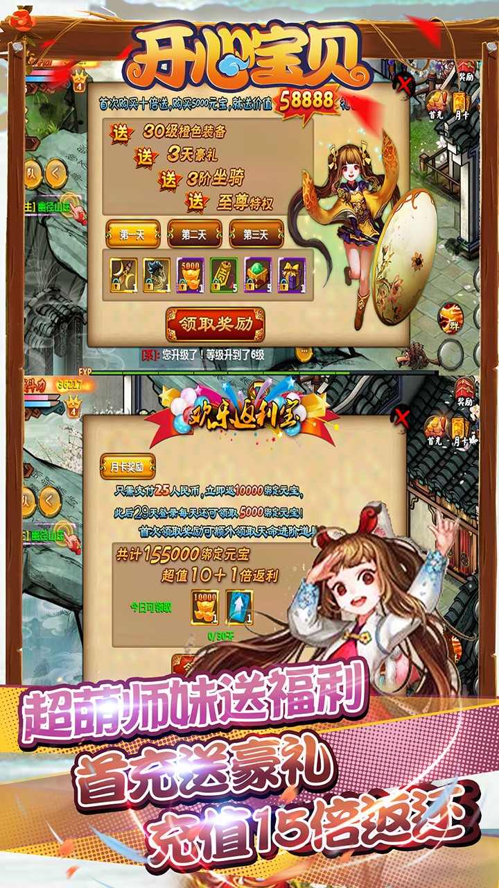 2.登录游戏即可免费领取3天首充豪礼,免费赠送30天月卡,元宝随便领