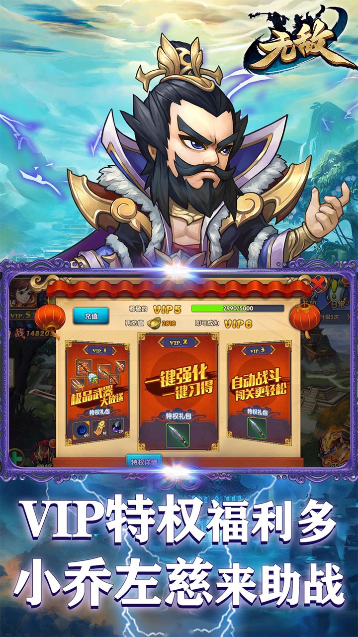 全民VIP特权,颠覆传统卡牌手游模式,丰富多样的玩法,精彩刺激的PK对决,轻松简单的武将培养,惊险刺激的实时国战。
