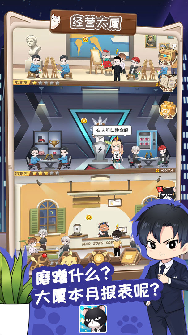猫总大厦是一款非常休闲模式的模拟经营类手游,特色国风妖灵随你召唤,利用他们的技能为你经营大厦,赚取更多的利润,不断壮大,构建自己的商业帝国大厦,感兴趣的玩家赶紧来下载猫总大厦官方版试试吧。