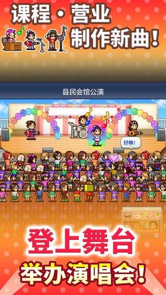 -本作继承了 kairosoft的一贯传统,是一款像素风格的模拟养成游戏。玩家在游戏中将会成为一名音乐事务所的社长,自己培养出优秀的偶像和歌手。玩家要在游戏中通过投放广告等行为,不断的挖掘有潜力的新人,并通过各种培训和包装,让他成为一名优秀的艺人。