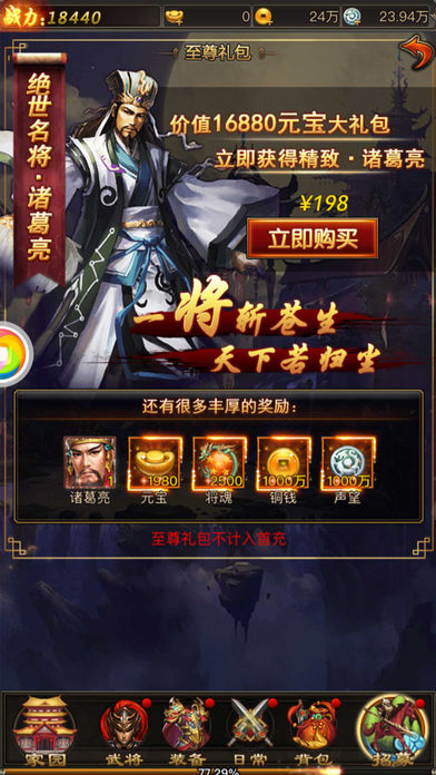 是一款以卡牌育成作为主要玩法的三国策略新游。即时战斗,卡牌深度养成,阵营国战玩法。这是一个权势争夺的世界,上线就送vip和礼包奖励,升级可以领取更多武将,不氪金就可以成为全民大主公哦!