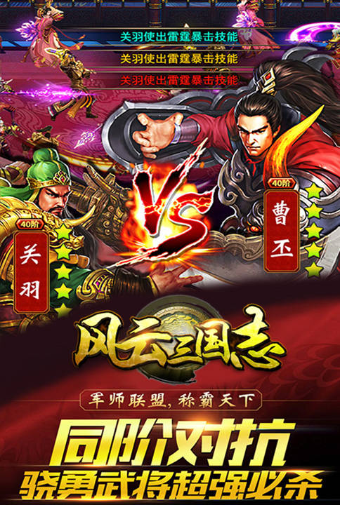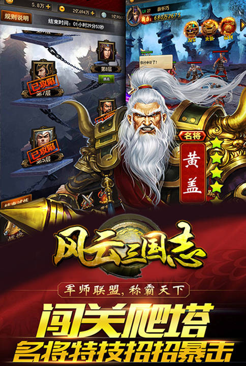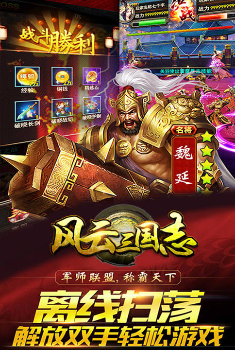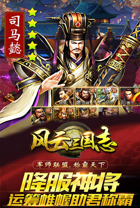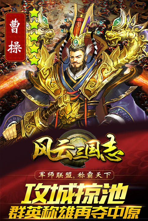 三国乱世经典再现,万千名将任你差遣,布阵闯关攻破城池,逐鹿中原一统天下!《风云三国志》是一款三国题材的卡牌类手机页游。集角色扮演、养成收集、挂机、对战、多人同屏等多种元素于一身,让你体验丰富的玩法。“酒馆招募”与“游历名将”、“战役招降”等多样武将招募方式,可让你收集培养各式武将。“试炼塔”与“英雄殿”,可让你挑战名将练级再打boss。游戏更新增航海、挖矿、城池争夺、实时PK等特色玩法,满足你发现新世界,开拓三国霸业的雄心壮志。