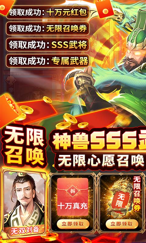 3、十万破解红包,升级推图皆可领,还送SSS武将,专属武器,神器,无限召唤券