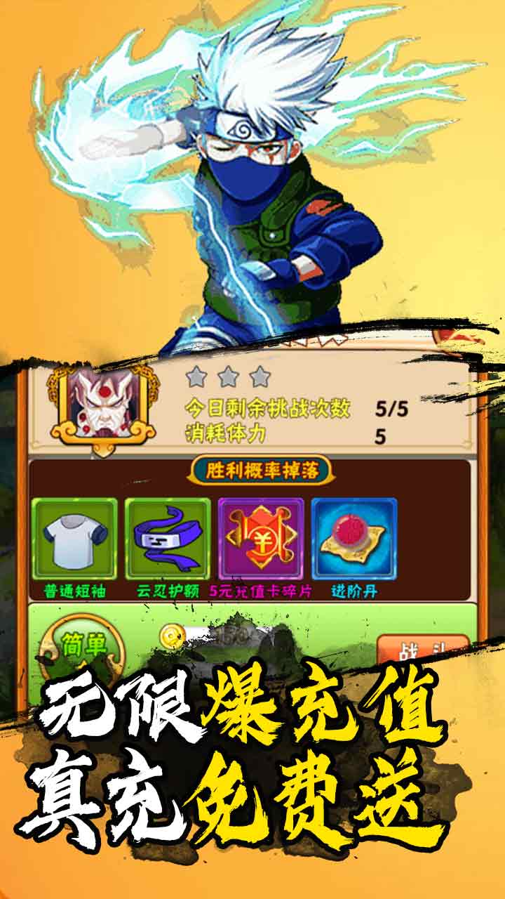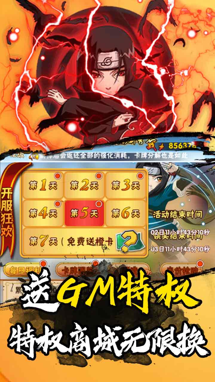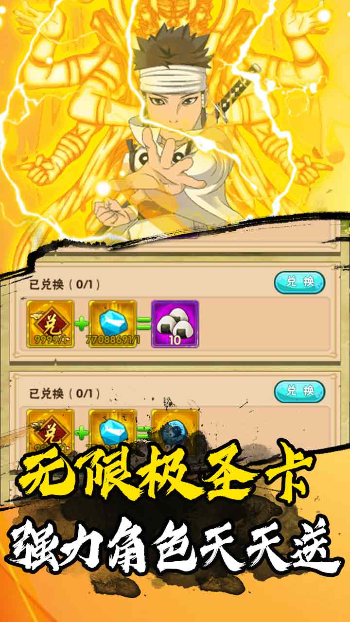上线赠送特级VIP,钻石88888;全民送无门槛超V商城忍者特权,顶级圣卡随便玩!游戏内还原原版IP火影剧情和事件,拥有动漫Q版造型,结合卡牌玩法,百种禁术忍术随意搭配;让你感受一个截然不同的忍者世界!
