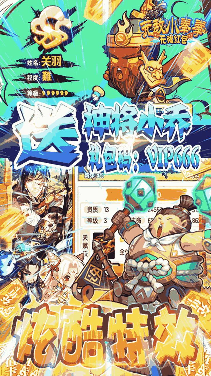 2.另还有4大豪礼:送钻石18888 送99万元气币(礼包码VIP999) 送神将小乔(礼包码VIP666) 送功夫熊猫(礼包码VIP888)