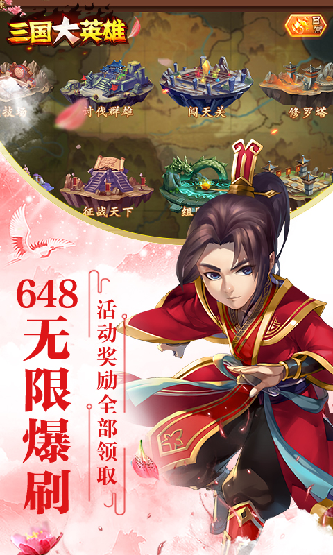 《三国大英雄》是根据三国时代的历史改编的手机横版PRG网游,《三国大英雄》以Q萌的画风用卡牌的方式诠释了三国中耳熟能详的各个名将,并且根据历史上的名将关系产生了缘分系统,有缘分的名将助阵可以获得额外的属性加成。《三国大英雄》不仅将三国的各路英雄,各大战役,著名地点都一一还原,还将加入了新的写实元素,发生更多的恩怨情仇,发生更多的庞大战役,战火将遍布三国各地! 30元连点5次648,千元无限爆刷648!