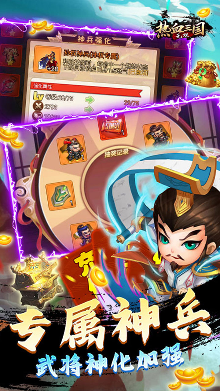 热血三国无双GM神将版是一款热血PK战斗操作的回合制游戏,采用萌系Q版的立绘画风,在这里玩家们可以体会到不同武将英雄随机搭配的更多阵容,带领他们和全服的玩家们开启天命之战,感兴趣玩家赶紧来下载热血三国无双GM神将版试试吧。