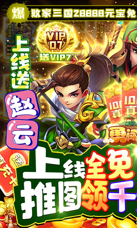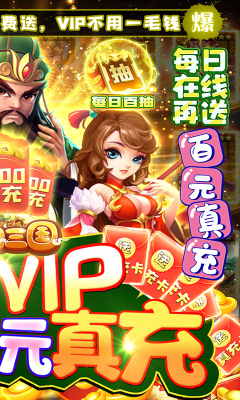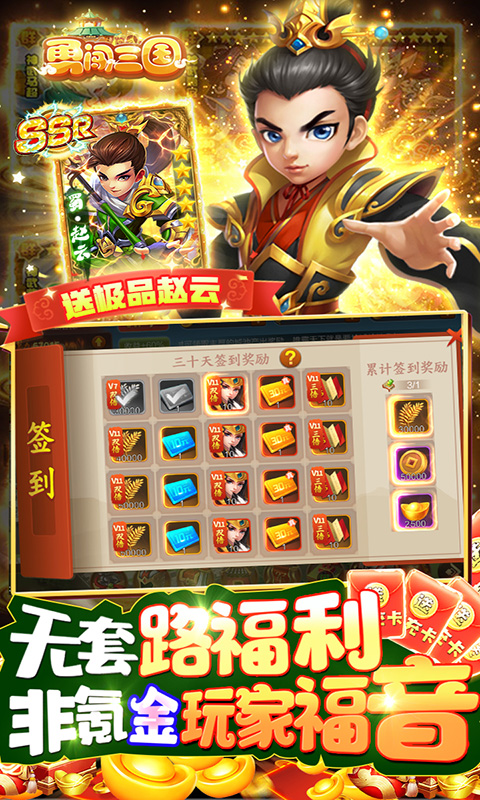 后缀说明:上线送极品武将赵云,通过7天登陆活跃最高可领取价值千元真充卡,不氪金也能抽奖拿道具,另外还送200张三国古卷
