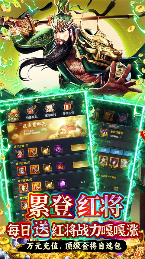 4、登录领SSSSR武将,签到、升级领万元红包、充值